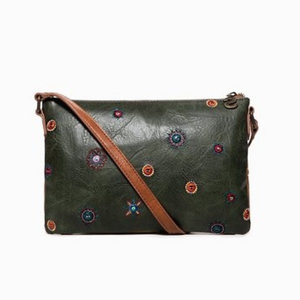 Kisebb méretű, barna és mustárszínű praktikus oldaltáska, színe mandala hímzésekkel díszítve. Kívül egy nagyméretű zsebbel és belűl is található egy cipzárral záródó zseb. Oldalpántja állítható.