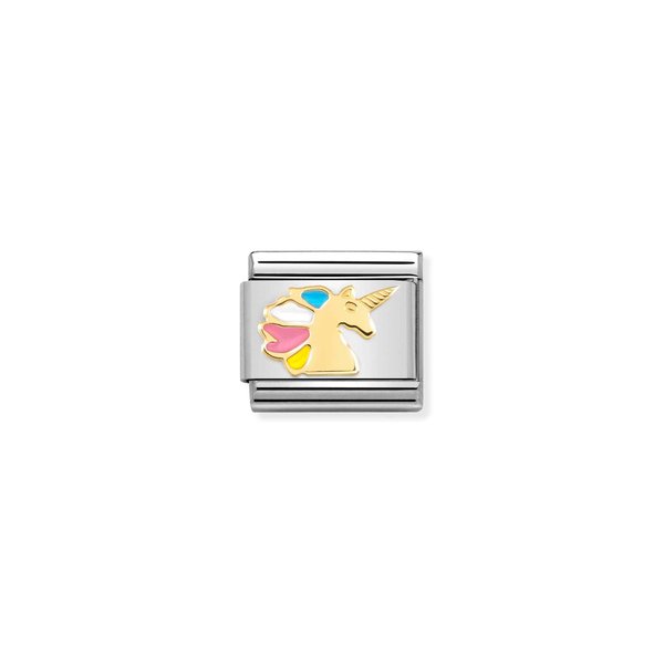 A Nomination Arany unikornis színes charm a Nomination "Composable" - magyarul tetszőlegesen összeállítható - moduláris karkötő rendszer eleme, amely a rendszer karkötőibe integrálható. A charm nemesacélból és 18K aranyból készült, a charm alapteste 1 cm széles, amit az arany unikornis motívum díszít. A charm karkötőbe történő bekötését megnézheted alábbi videónkon.