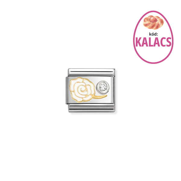 Eredeti kombinálható charm a Nomination Composable Classic karkötőhöz, fehér rózsa charm cirkóniával, 18 karátos aranyból, rozsdamentes acél alapon.