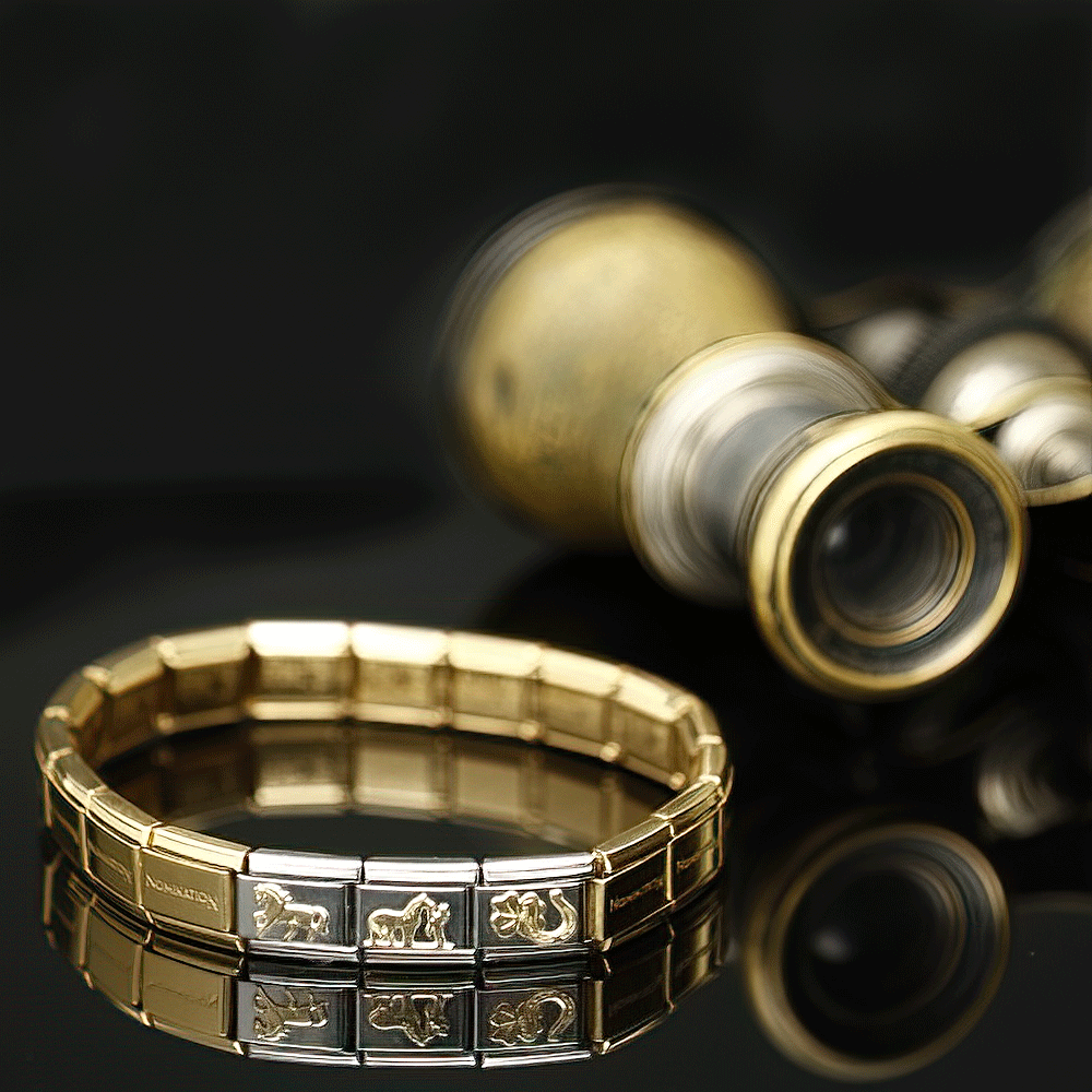 A Nomination lovas karkötő 16 aranyszínű alap karkötő elemet és 3 darab ezüst és arany színű lovas motívumokkal díszített charmot tartalmaz. A karkötő így összesen 19 charm elemből áll, így a maximum 17 cm kerületű csuklóra helyezhető fel.