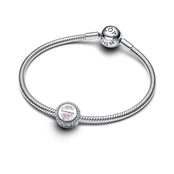 Ünnepeld a leendő menyasszonyt a Lánybúcsús csapat ezüst charmmal, amely a barátság és az összetartozás ragyogó jelképe. Finom sterling ezüstből készült, közepén a „Team Bride” felirat kapott helyet, amelyet rózsaszín és fehér tűzzománcvirágok díszítenek. A charm peremét csillogó cirkónia kövek sora öleli körül, kifinomult fényt és elegáns megjelenést adva az ékszernek. Ideális ajándék a menyasszonynak vagy a koszorúslányok számára, hogy örök emlékként őrizze egy igazán különleges alkalom pillanatait.