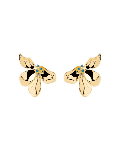 Egy kibontakozó virág, amelyet finom kék cirkóniák díszítenek, az egyedi retro hangulatot hordozó Fleur fülbevaló magja. Gondosan polírozott és 18k arannyal bevont, a növényvilág rugalmassága és finomsága által ihletett kollekcióban.