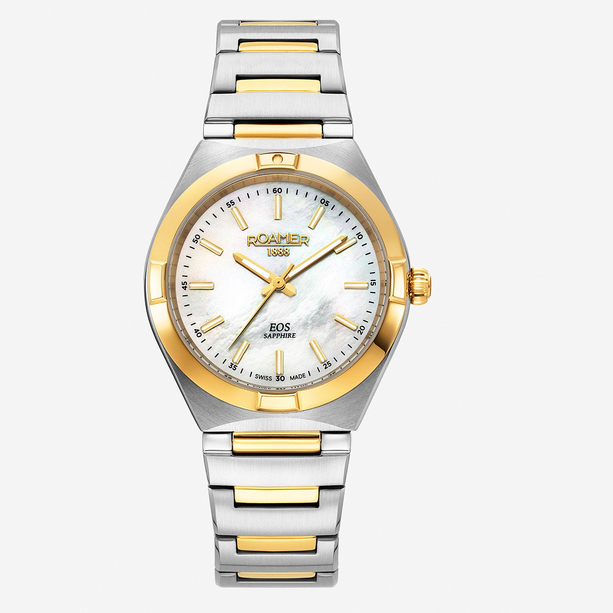 A Roamer Eos Classic bicolr világos gyöngyház számlapos pálcika indexes karórája egy 50 m-es vízállósággal rendelkező elegáns női kvarcóra, amely mind ünnepi alkalmakkor, mind a hétköznapokban ideális kiegészítője lehet outfitednek. A Roamer Eos Classic 982847 47 20 20 világos gyöngyház számlapjához tökéletesen harmonizál a szépen kidolgozott 37 mm átmérőjű ezüst/arany bicolor rozsdamentes acél tok és a pillangózáras masszív tömör szemes szintén két színű acél szíj.