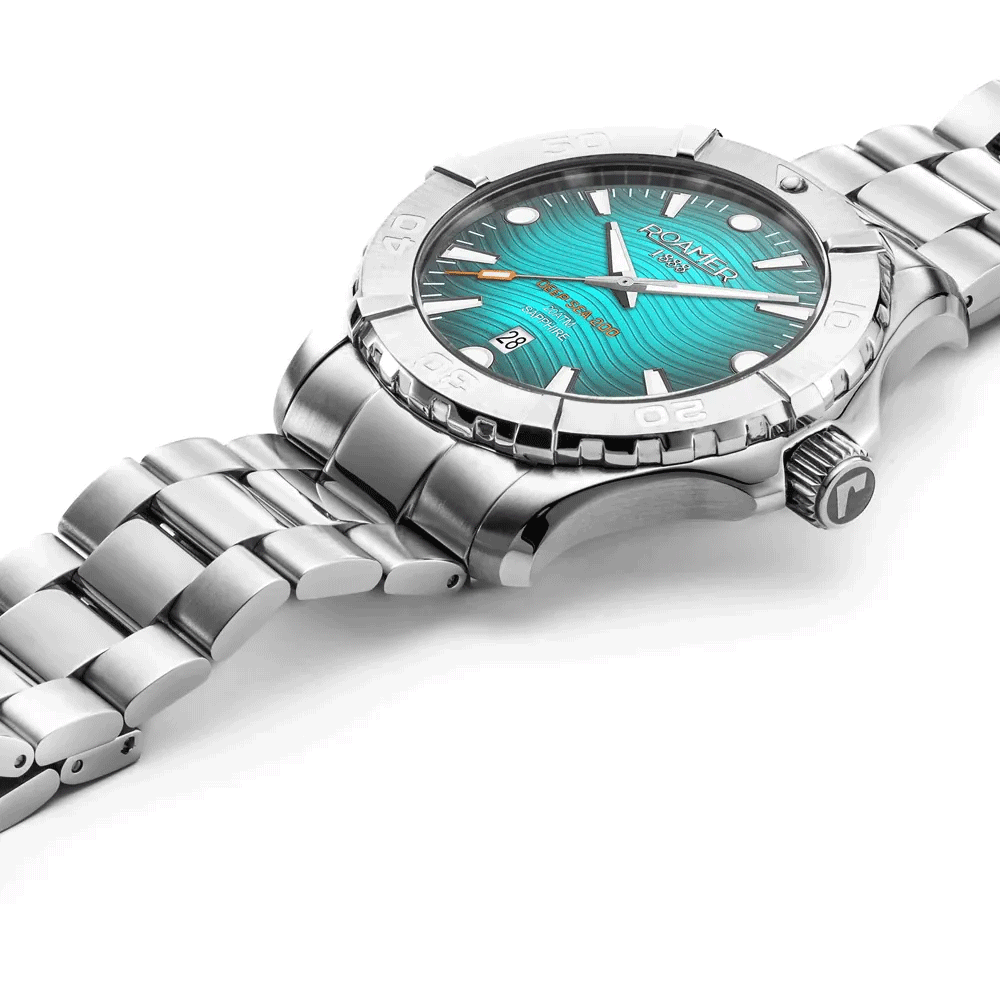 A Roamer DEEP SEA 200 bicolor 20ATM vízállóságát a masszív tok, a menetes hátlap és a koronazár garantálja, úszáshoz, fürdéshez, vízi sportokhoz, de akár még könnyűbúvárkodáshoz is bátran használhatjuk. Az óra számlapja, számlapjának struktúrája, a dekoratív guilloché hullámminta a tenger hullámait tükrözi, a 120 klikkes búvárlünetta szintén a búvárórák sajátossága.