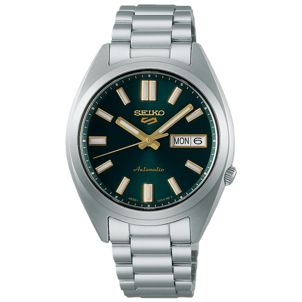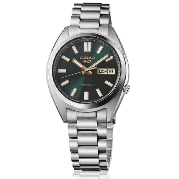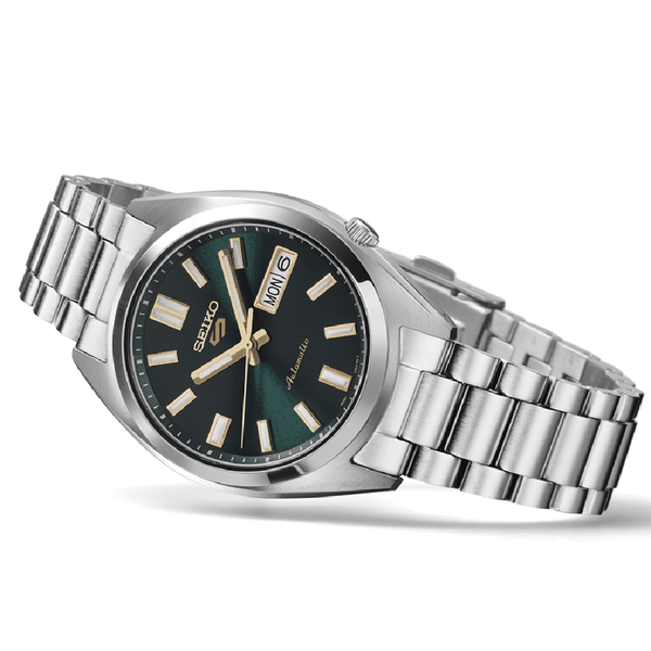 Az 5 Sports SNX Vintage Gold Collection 'In Green Tie' modell a Seiko legendás stílusát ötvözi a modern sportossággal. Ahogy a neve is sugallja, a mélyzöld számlap és az arany tónusú részletek kombinációja olyan elegáns és harmonikus összhatást kelt, mint egy tökéletesen megválasztott selyemnyakkendő egy sötét öltönyhöz. A számlap finom selyemfénye kiemeli az arany színű mutatókat és indexeket, miközben az óra megőrzi az 5 Sports szériára jellemző robusztus felépítést és automata megbízhatóságot.