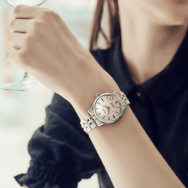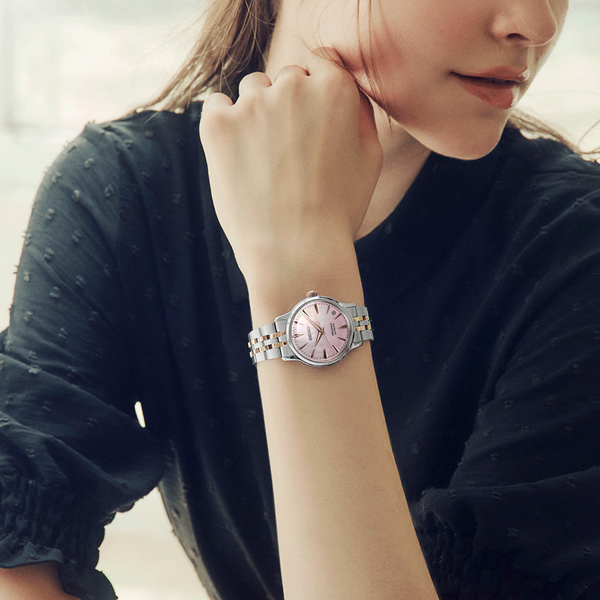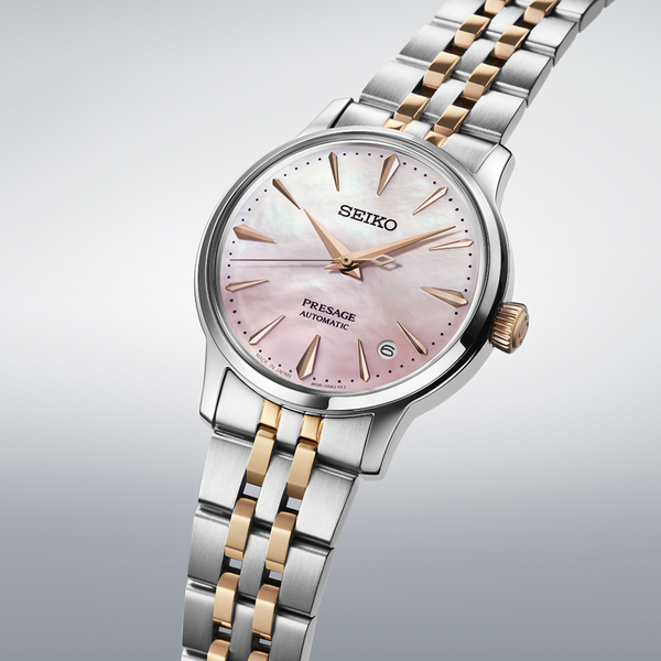 A Seiko Presage Cocktail Time SRPM06J1 “Sakura Aviation” limitált kiadás a japán tavasz hangulatát idézi meg a Cocktail Time kollekció elegáns világában. A modell inspirációját a Sakura Aviation koktél adta, amely a cseresznyefa virágzásának finom, fehérből halvány rózsaszínbe forduló árnyalatait hozza el a számlapon. A gyöngyház hatás és a lágy színátmenet különleges mélységet ad az órának, miközben a rózsaarany részletek kifinomult, nőies karaktert kölcsönöznek neki.