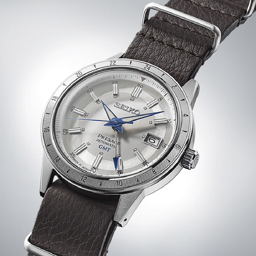 A Presage Style 60’s GMT órái minden esetben egy plusz mutatót kaptak, amely ebben az esetben nem 12, hanem 24 óra alatt jár körbe, és a 24 órás időbeosztású GMT lünettán teszi leolvashatóvá egy második időzóna pontos idejét.