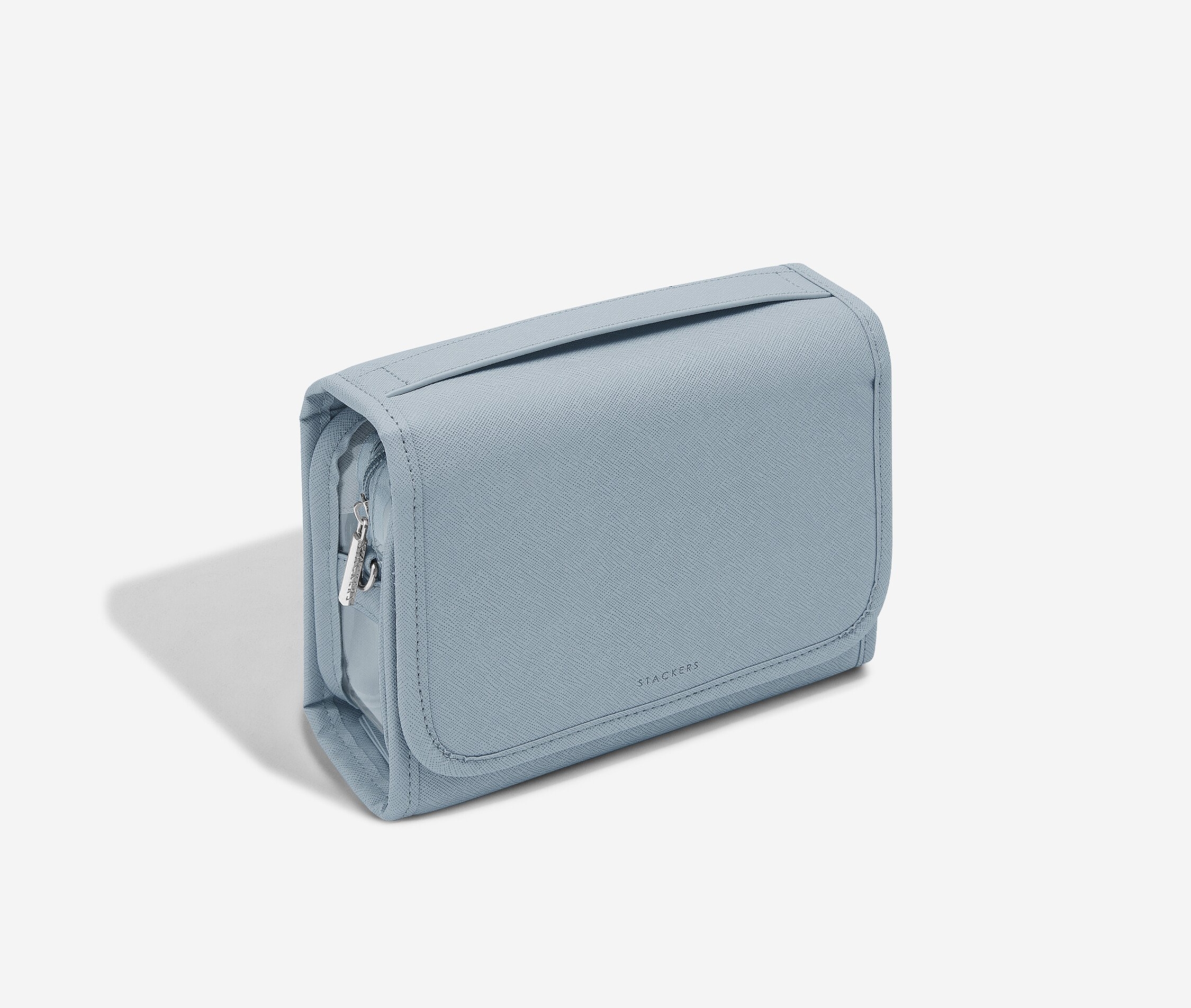 Ez a Stackers angolkék kisméretű piperetáska a tökéletes mérret egy rövid utazásra. A táskát szetnyitásakor fel lehet akasztani. Belsejében 2 cipzáras rekesz és egy átlátszó kivehető piperetáska található.