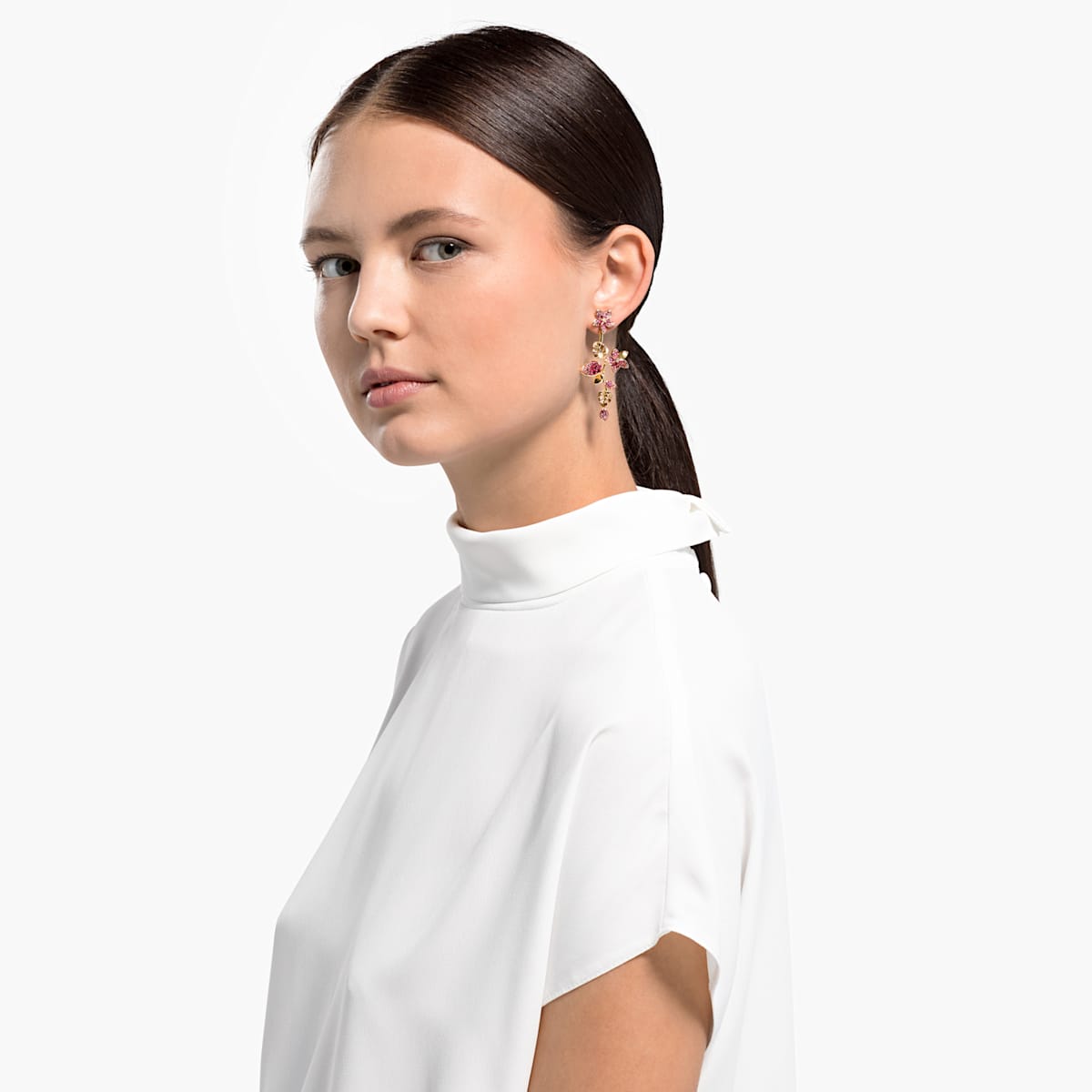 Ez a Swarovski fülbevaló igazán divatos formavilággal rendelkezik. A trópusi kertek bujasága ihlette arany árnyalatú bevonattal ellátott levelek és a rózsaszín kristályszirmok együttese élénk színorgiát hoz létre, különösen akkor, amikor a Swarovski kristályokon megtörik a beeső fény. A visszafogottabb megjelenés érdekében a virág alakú bedugós elemről a levelek eltávolíthatók. Lenyűgöző ajándék különleges alkalmakra.