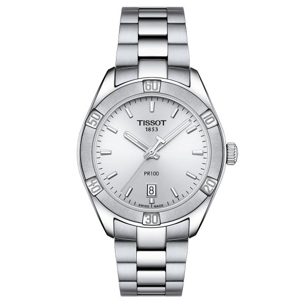 A Tissot PR 100 Lady Sport Chic egy sportos női óra, amely a PR 100 kollekció időtlen designját ötvözi a svájci precizitással és megbízhatósággal. A 36 mm-es átlagos nagyságú tok minden csuklón jól mutata, az ezüst számlap a ráeső fényben az ezüst árnyalataiban játszik. Az inkább minimalista számlapon a Superluminova bevonatos indexek és a mutatók sötétben is biztonsággal informálnak a pontos időről. A számlapon 6 óránál, a keretes  dátumablak az aktuális dátum figyel. A nemesacél tokhoz egy kétrészes biztonsági záras békazárral működő elegáns nemesacél szíj kapcsolódik.